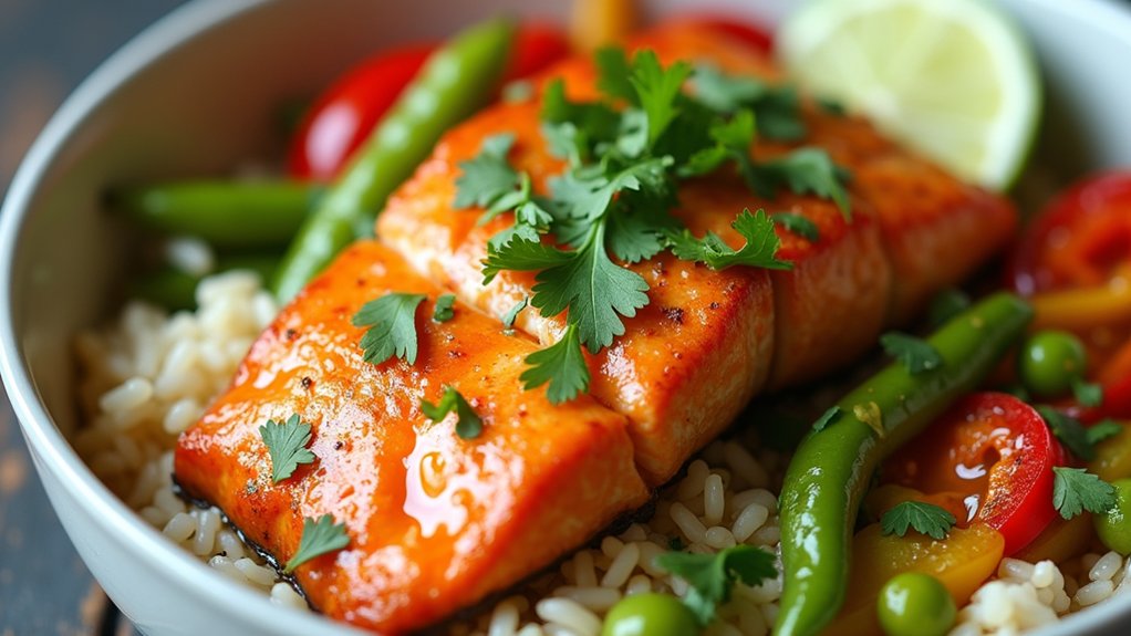 - Assemble the Rice Bowl: Divide the cooked rice among serving bowls. Top each with a salmon fillet, sautéed vegetables, and drizzle with the remaining coconut curry sauce. Garnish with fresh cilantro and lime wedges.