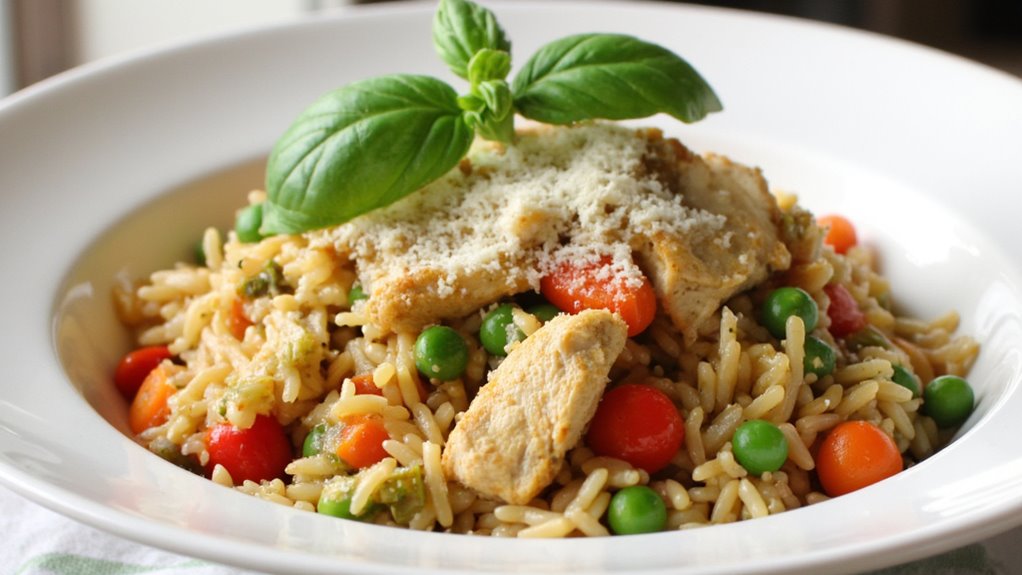 - Finish and Serve: Sprinkle the grated Parmesan cheese over the top and mix until melted and well incorporated. Taste and adjust the seasoning with additional salt and pepper if needed. Garnish with fresh basil leaves if desired. Serve the Pesto Chicken Fried Rice hot.