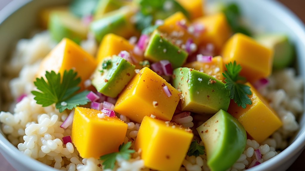 4. Assemble the Rice Bowl: In a large mixing bowl, combine the cooked rice, diced mangoes, diced avocados, and chopped red onion. Pour the lime dressing over the mixture and gently toss to guarantee everything is well coated.