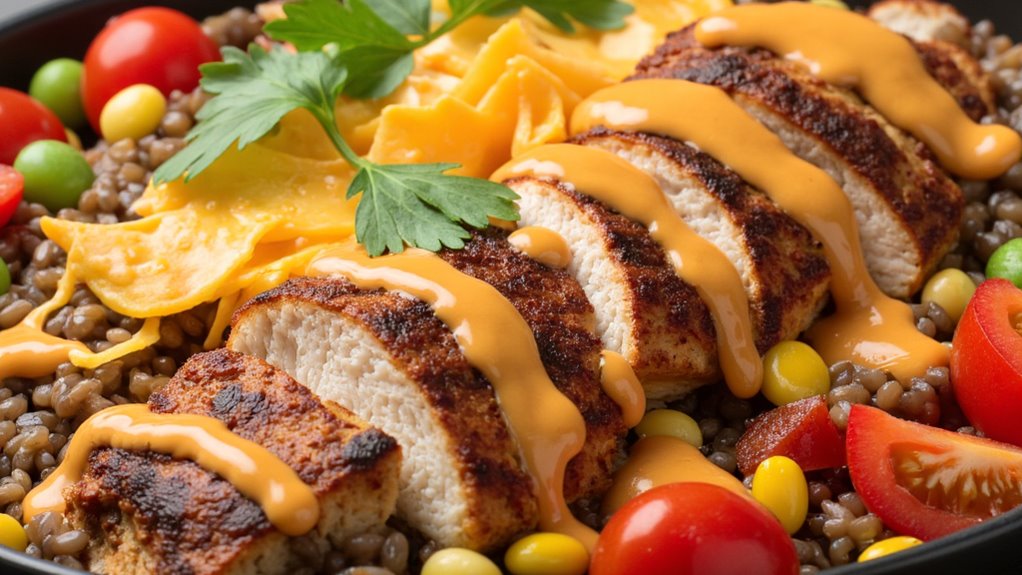 - Add Chicken and Dressing: Arrange the sliced chicken over the rice and vegetable mixture. Drizzle the BBQ ranch dressing generously over the top.