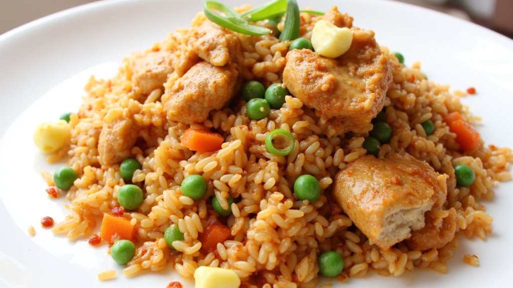 - Serve: Serve the Peanut Sauce Chicken Fried Rice hot, garnished with additional chopped peanuts and green onions if desired.