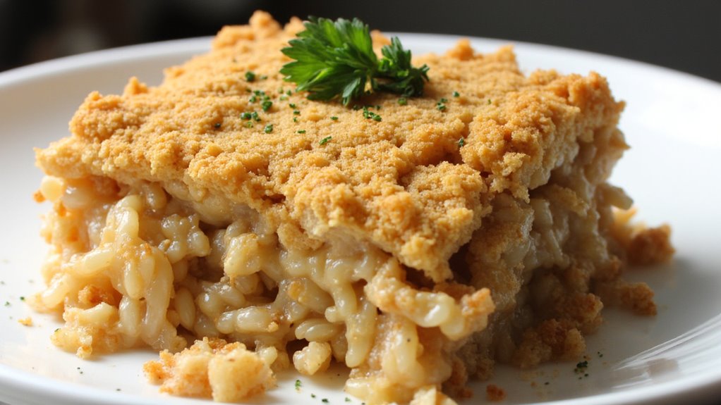 Transfer the rice mixture to a greased 9×13-inch baking dish. Spread evenly and top with breadcrumbs. Bake in the preheated oven for 20-25 minutes, or until the top is golden brown and crispy.