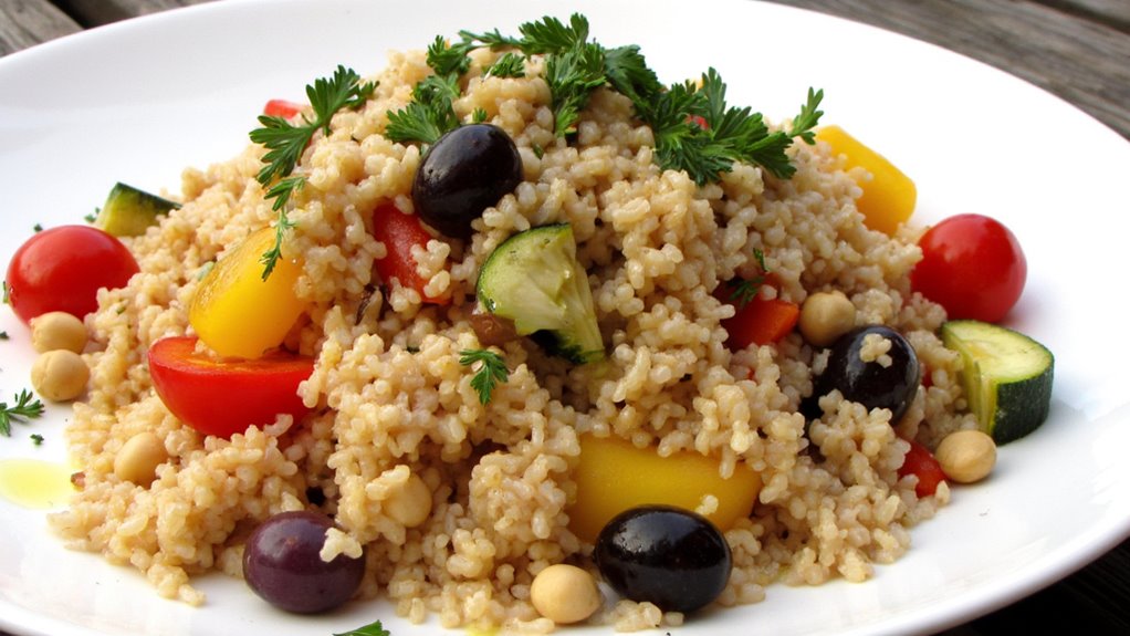 - Combine Quinoa and Sauce: Add the cooked quinoa to the skillet, mixing well with the vegetables. Pour in the soy sauce and Sriracha, stirring to guarantee the quinoa is evenly coated. Cook for 3-4 minutes, allowing the flavors to meld together.