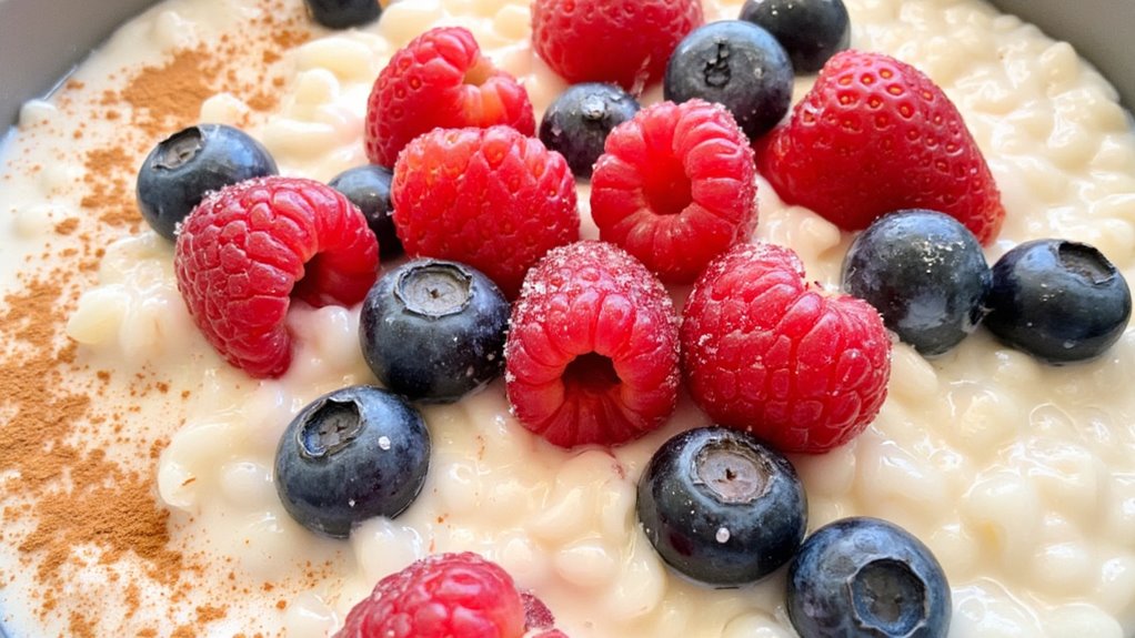 - Finish and Serve: Once the pudding is cooked, turn off the slow cooker and let it sit for a few minutes to thicken further. Serve the rice pudding warm, topped with additional fresh berries or a dollop of whipped cream if desired.